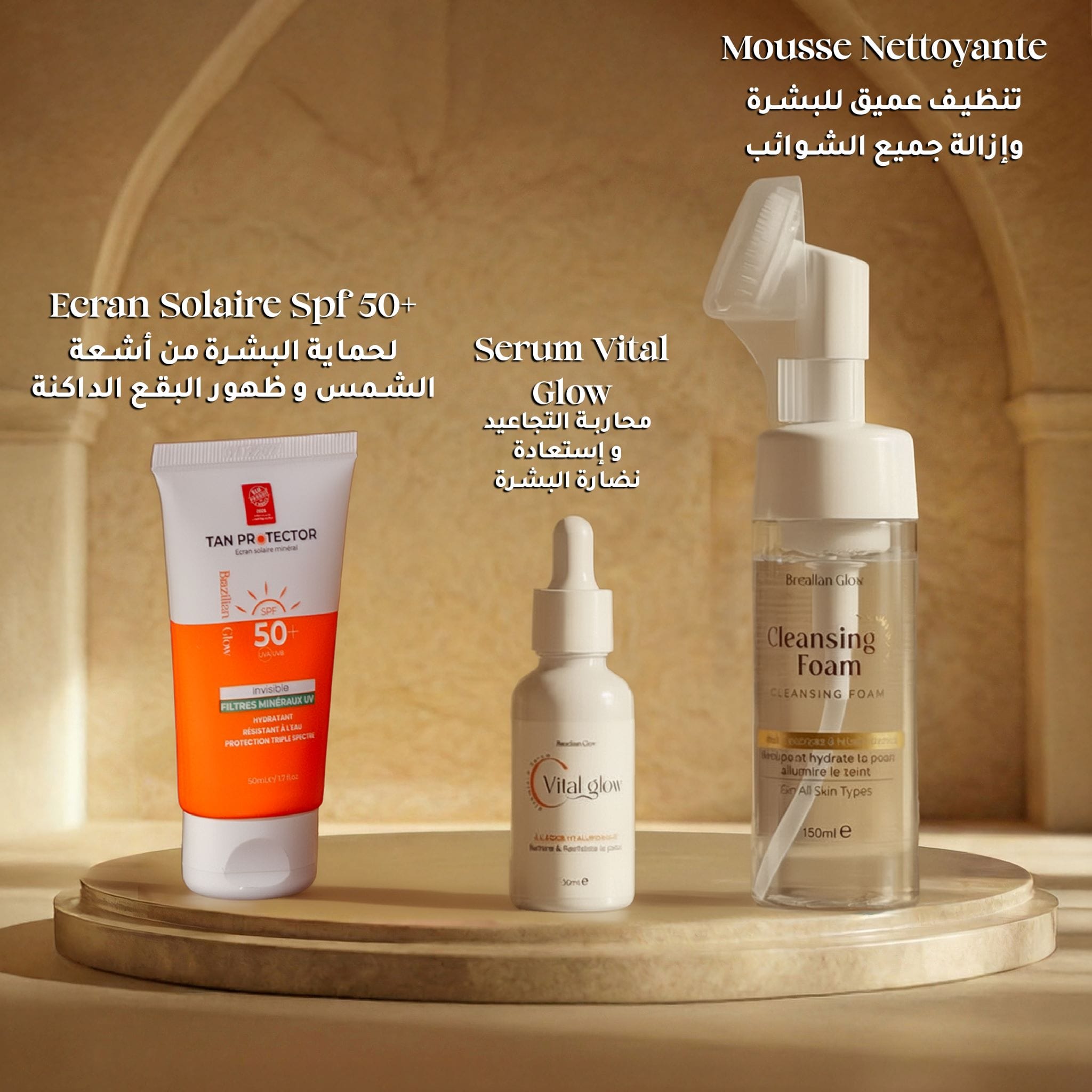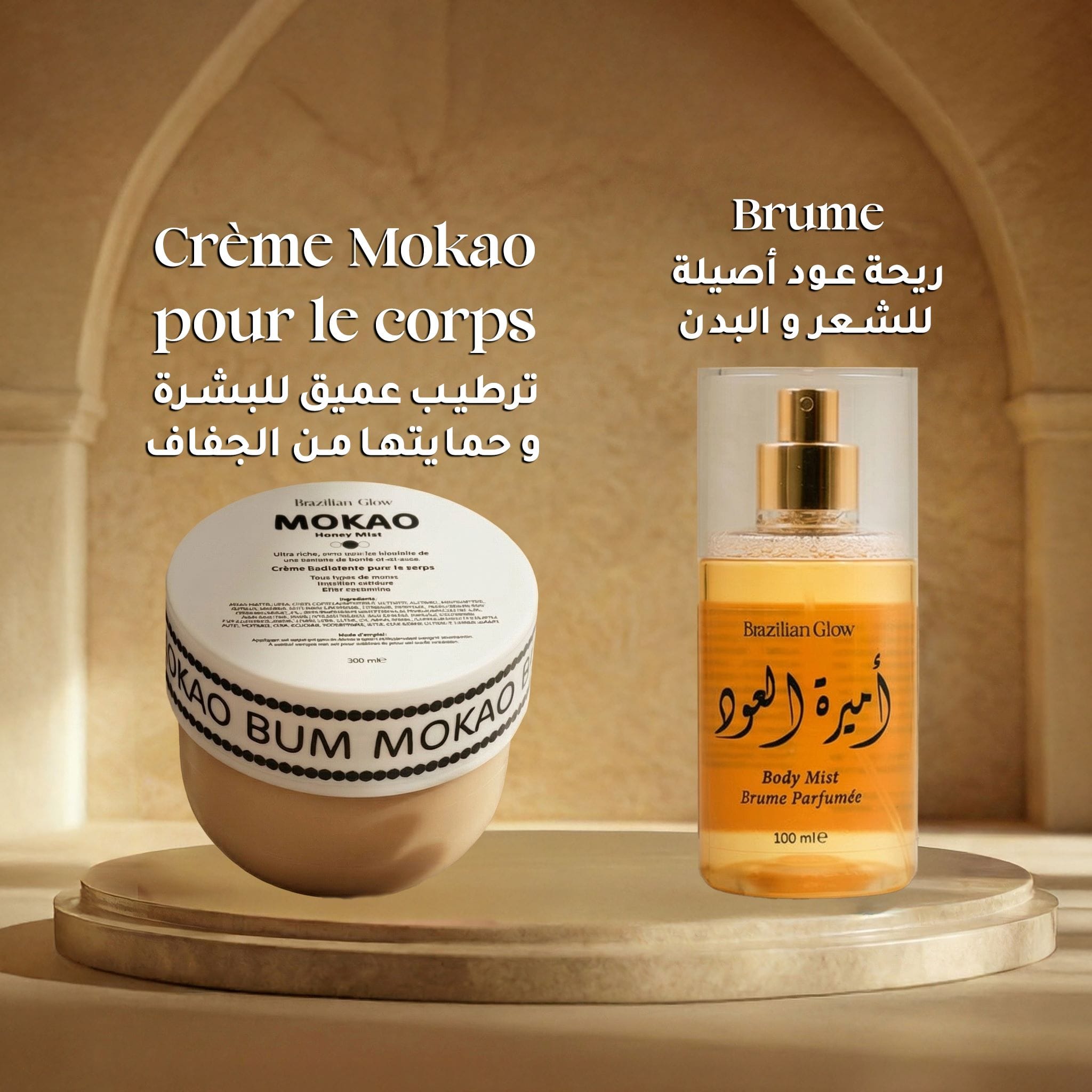 Nettoyer le visage avec la Mousse Nettoyante, appliquer le Serum Vital Glow, puis l’Écran Invisible. Hydrater le corps avec la Crème Mokao et terminer avec la Brume Amiret Oud.